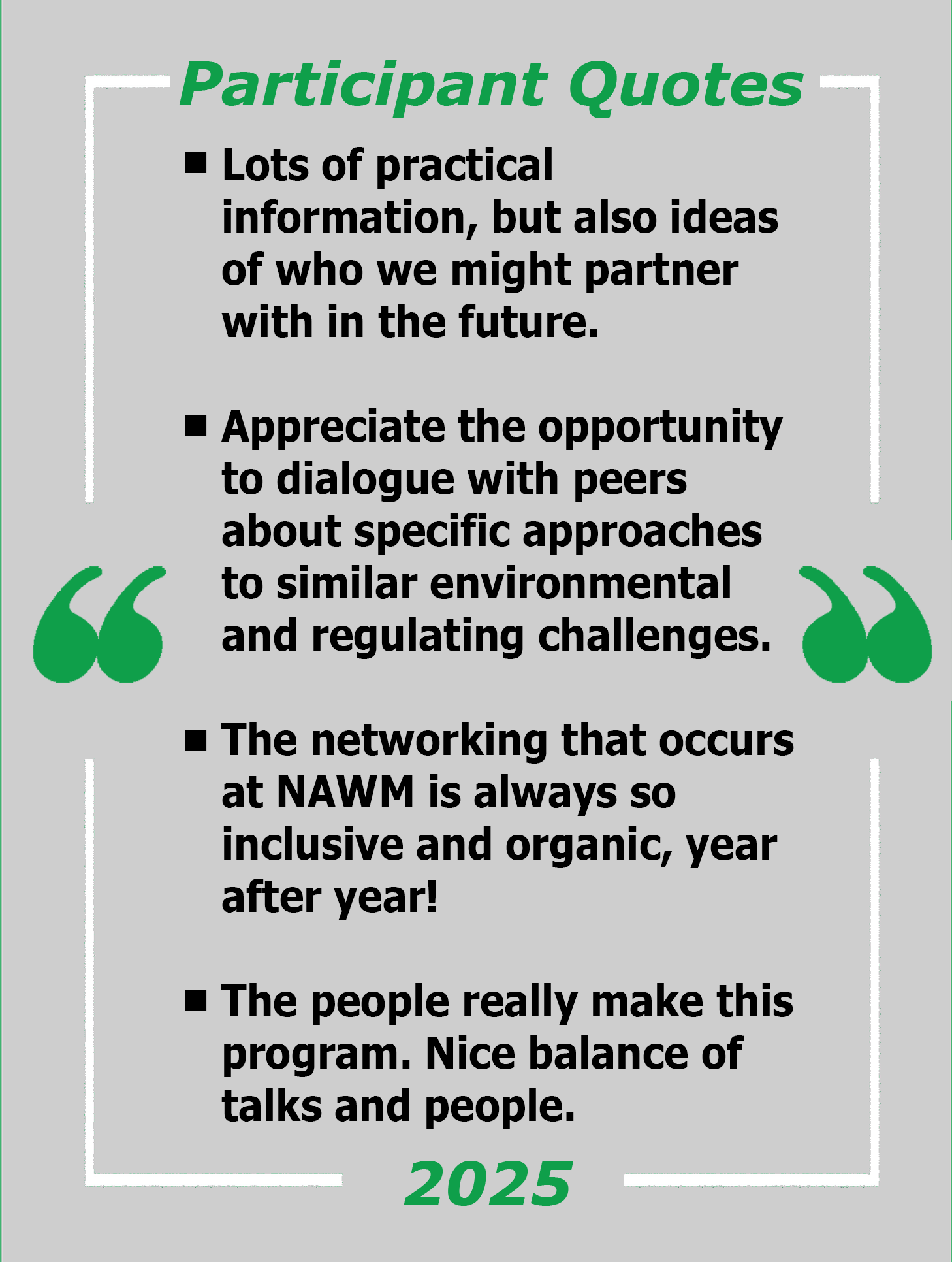 The 2026 meeting will be NAWM's 25th annual coordination meeting! The theme for this year's meeting is Celebrating America’s Wild and Wonderful Wetlands and it will be an amazing opportunity to gather together as a wetland community of practice, build partnerships, and explore new opportunities for wetland protection and restoration. The meeting sessions will cover a range of topics related to the management of our nation's precious wetland resources, with particular focus on wetland stewardship, new pathways for wetlands policy and conservation, effective and creative partnerships, and innovations in restoration.